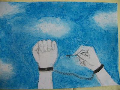 Moi uczniowie wzięli udział w szkolnej akcji plakatowej, podczas której w budynku naszego gimnazjum w każdym możliwym miejscu pojawiły się rysunki, zachęcające do dyskusji o prawach człowieka.
